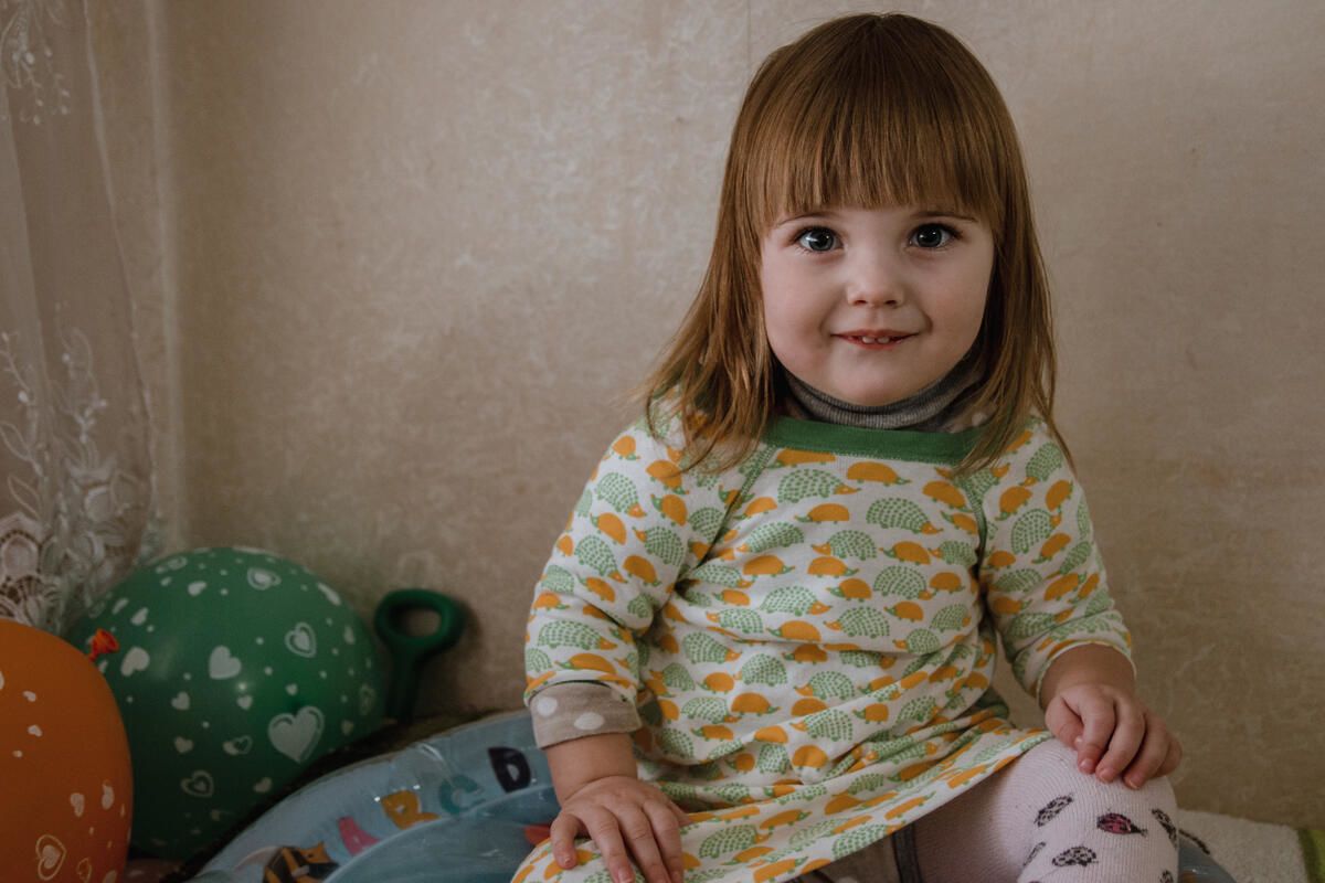Antonina (2) og hennes mor var blant millioner av familier som ble tvunget til å forlate hjemmet sitt med lite eller ingenting da krigen startet. De mottok hygienesett som inneholdt tannbørster, tannkrem, såpe, håndklær og andre viktige hygieneartikler.